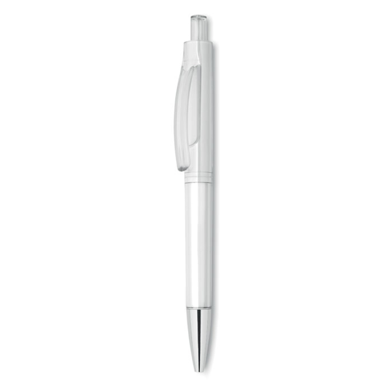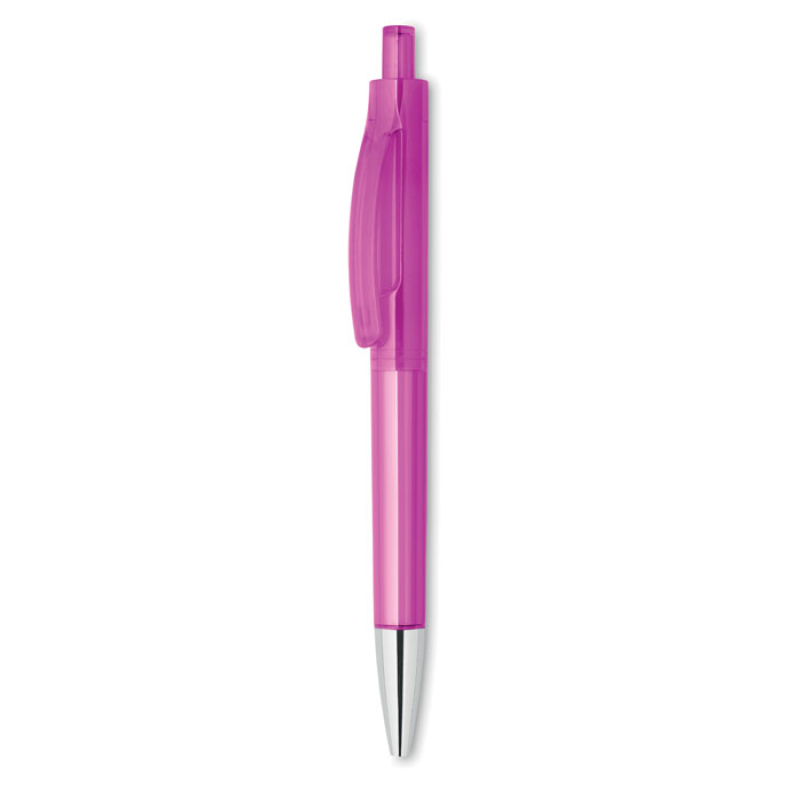 Push button ball pen in ABS with transparent barrel and shiny tip. Blue ink.