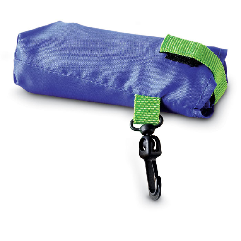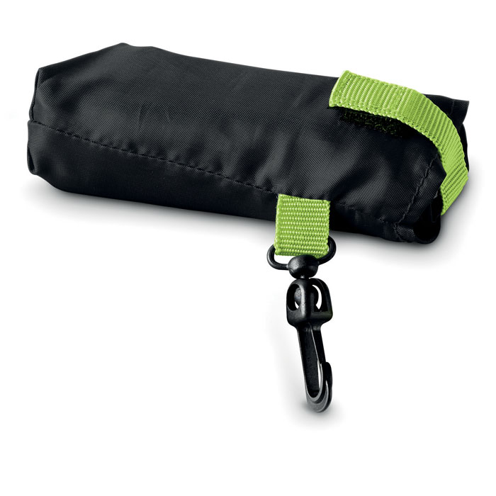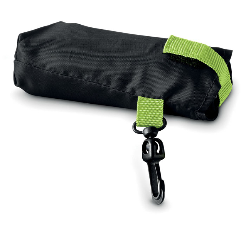 Foldable shopping bag in 190T polyester with pouch and plastic hook.
