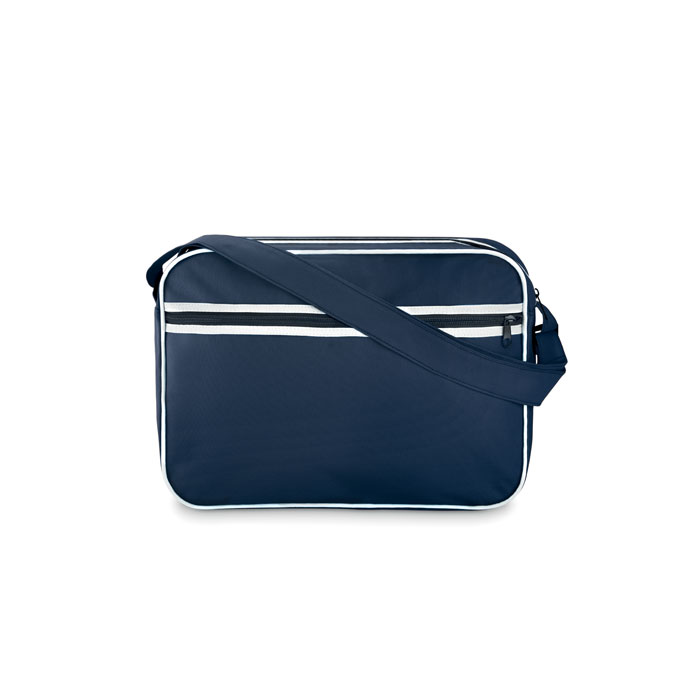 Document bag in 600D polyester with white trimming and piping. Front pocket closed by horizontal zipper. Adjustable shoulder strap.