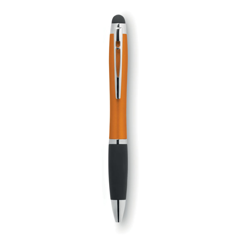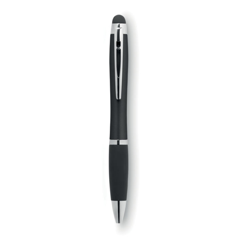 Twist action ball pen in ABS with stylus and soft grip. Blue ink. The barrel includes a light to illuminate the logo activated by pushing the stylus when an engraved logo is selected. The logo will not light up when pad print process is used. 3 AG3 cell batteries included.