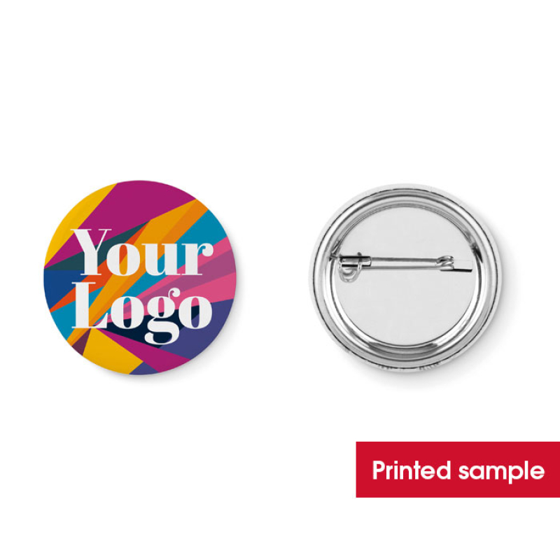 Pin button with paper inlay. Ø4,4 CM. Minimum order quantity 25 pieces. For unprinted orders the item comes unassembled.