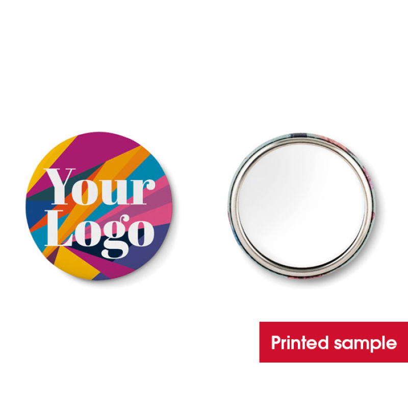 Compact Mirror with paper inlay. Ø5,8 CM. Minimum order quantity 25 pieces. For unprinted orders the item comes unassembled.