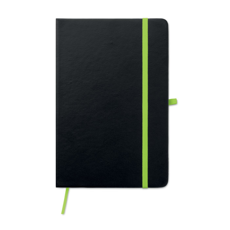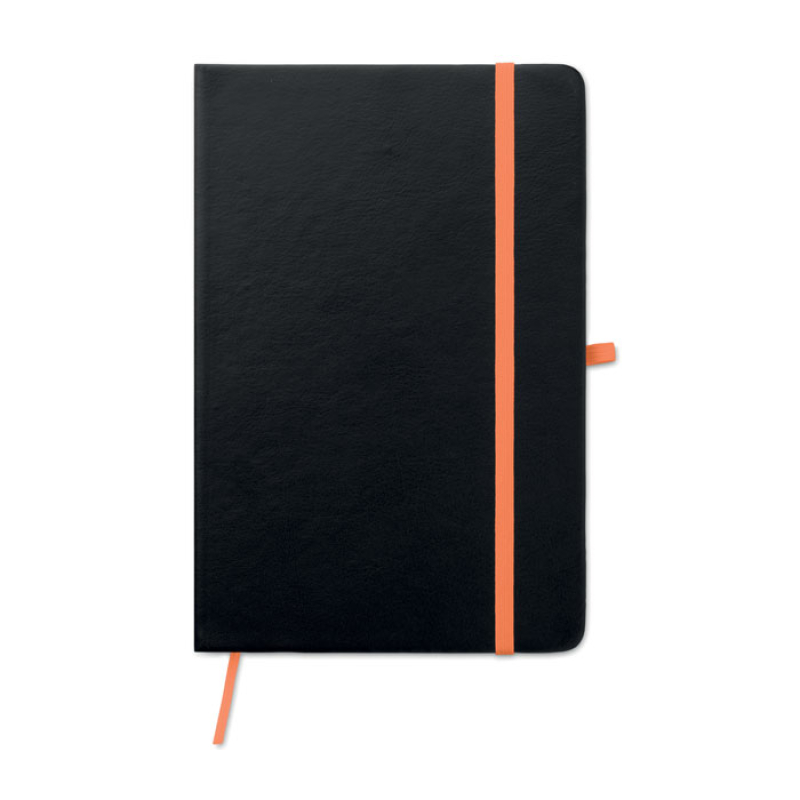 A5 notebook with PU cover and 96 lined pages with matching ribbon and elastic band. It has a pen loop and pocket on back cover. Your logo will show up in matching colour after laser engraving.