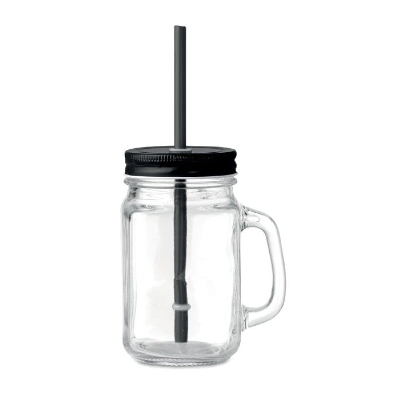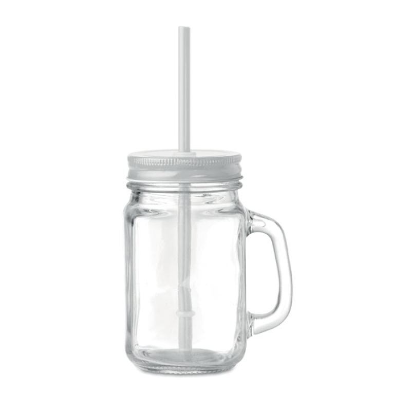 Mason jar glass with handle and tin lid. Includes a PP straw. Capacity: 450 ml.