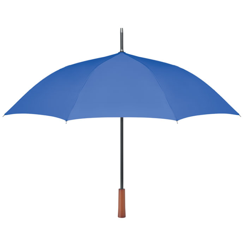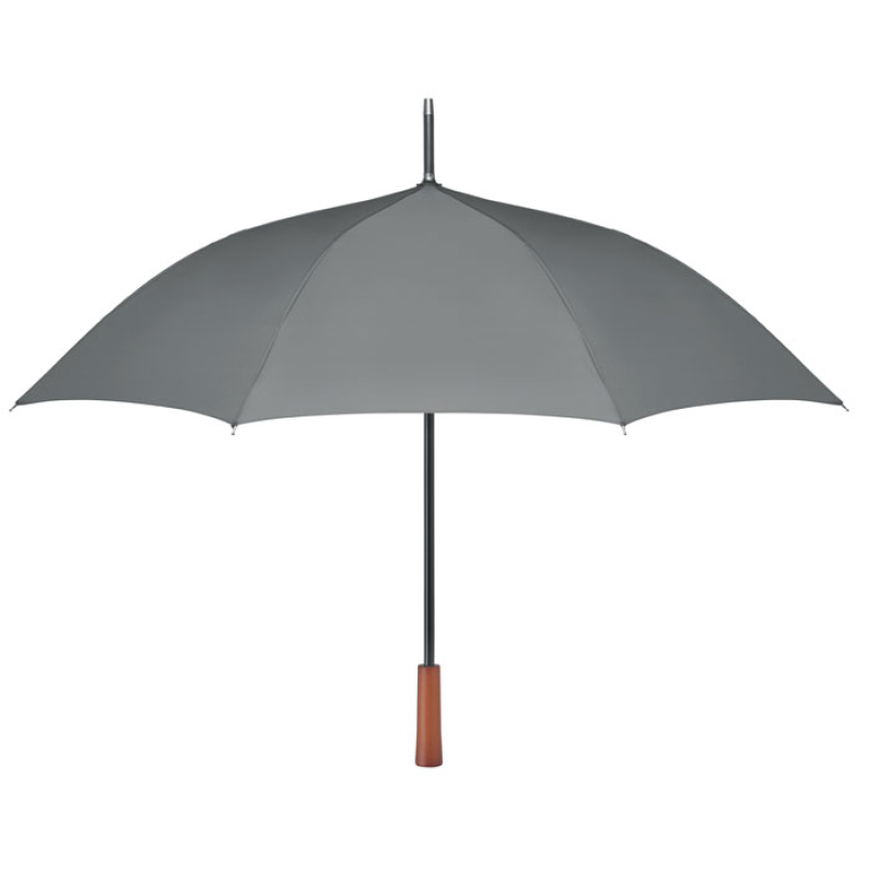 23 inch auto open umbrella in 190T RPET pongee fabric with black plated metal shaft and ribs. Straight wooden handle. Manual closure.
