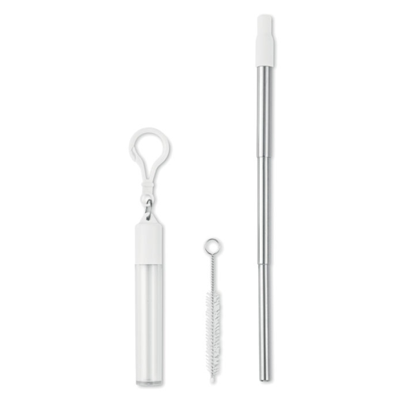 Stainless steel telescopic straw with cleaning brush in plastic tube with carabineer.
