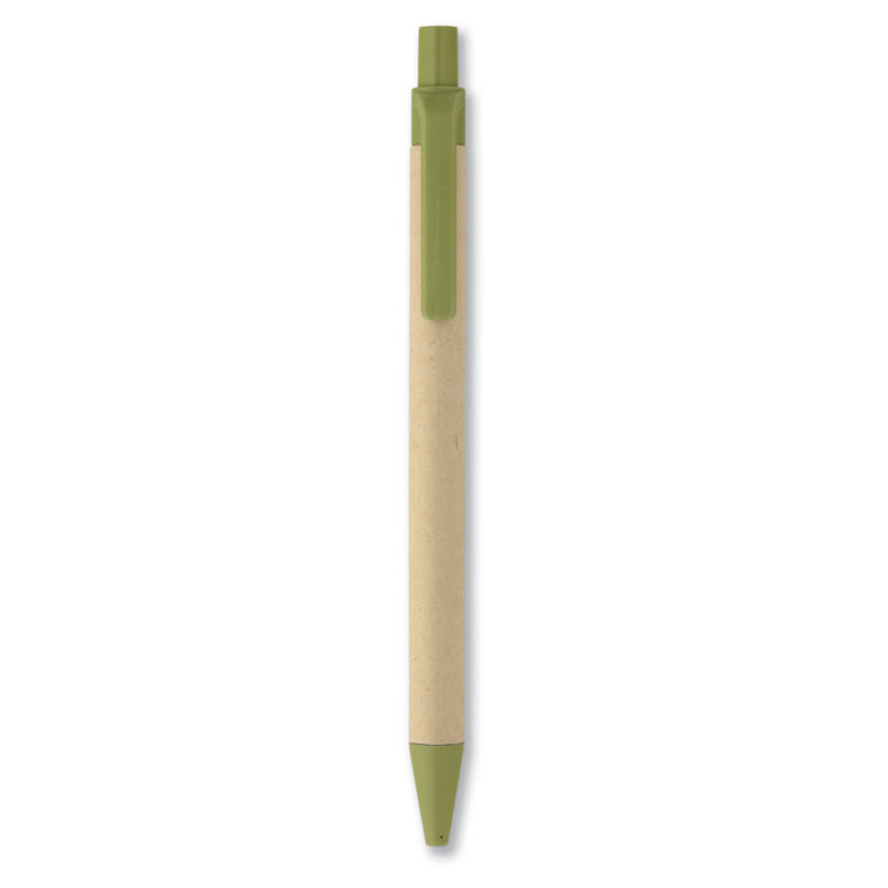 Push button ball pen with paper barrel and PLA parts (in 100% biodegradable corn). Blue ink.