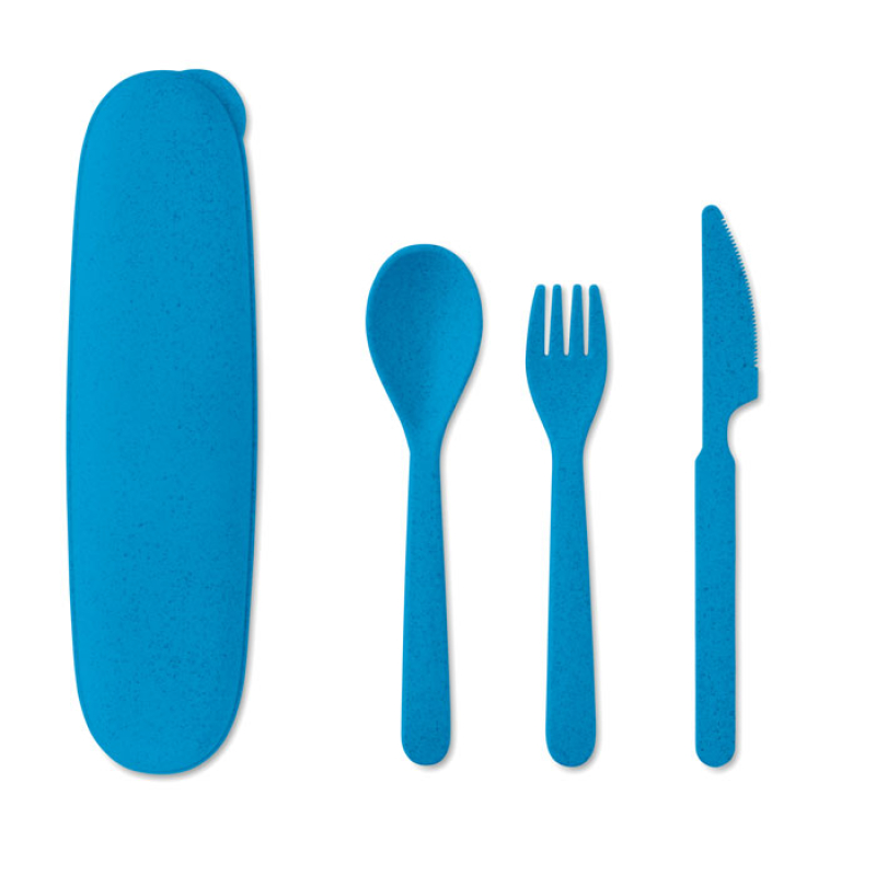 Re-usable cutlery set made of 50% wheat straw and 50% PP. Includes knife, fork and spoon in case. ''Not available for sales in the EU''