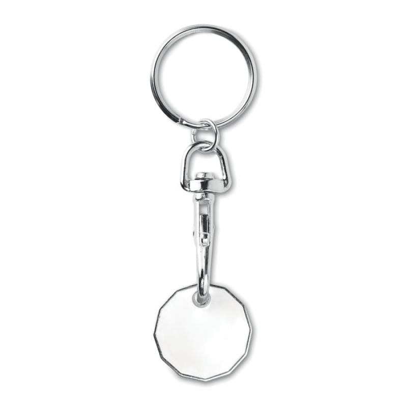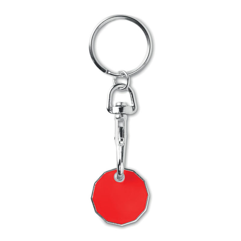 Metal keyring trolley pound (GBP) token. With imitation enamel coating on the front side. Token size Ø23,43x2,8 mm thickness.