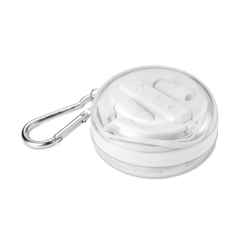 5.0 wireless earphones in ABS with built in microphone. Rechargeable Li-ion 70 mAh battery. Presented in a double sided case with carabiner. Including a charging cable with USB-A to Micro-B (2 in 1) and Type C.