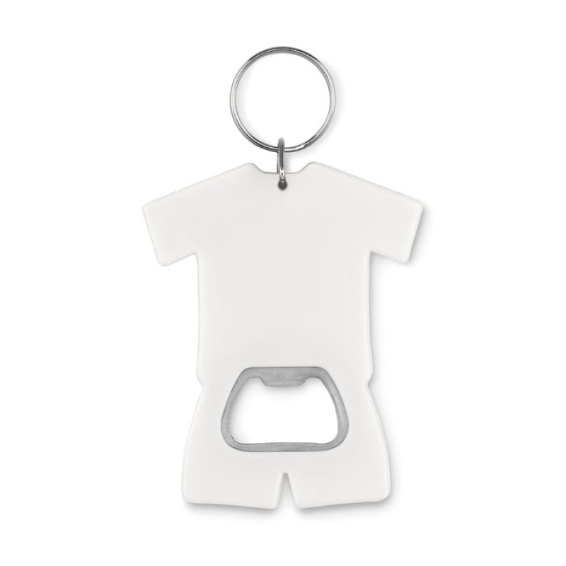 T-shirt shape bottle opener in ABS with key ring.