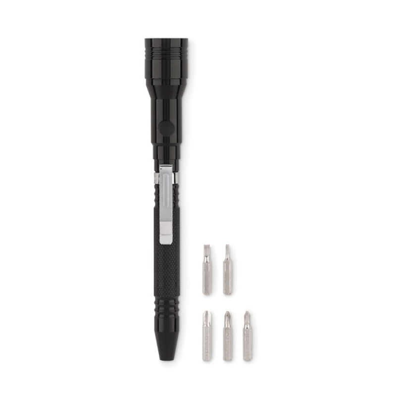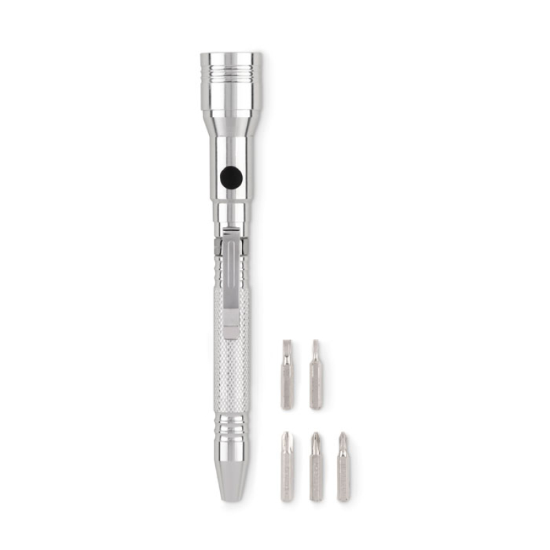 Aluminium torch with 3 LED lights, magnet and 5 screwdriver heads in aluminium tool pen shape. 4 batteries LR44 included. Present in box.