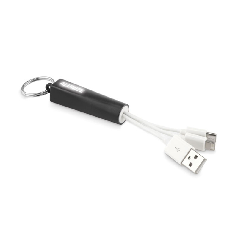 Key ring with charging cable with 1 USB-A to Micro-B (2 in 1 pin) and Type C. Logo can be laser engraved and the light will illuminate the logo.
