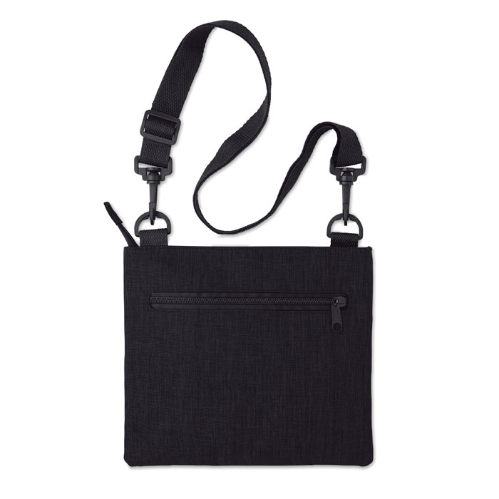 Travel bag with retractable and attachable strap. Including 2 zippered compartments. Main inner compartment includes an RFID protector.