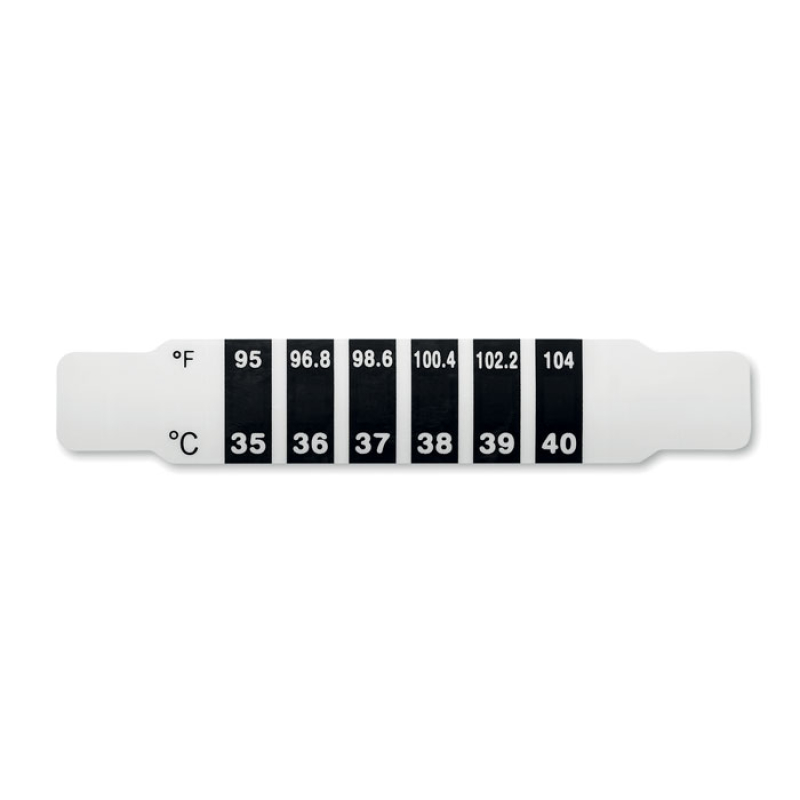 Fever indicator made of PET. It shows temperature in both Celsius and Fahrenheit. 0.18mm thickness.