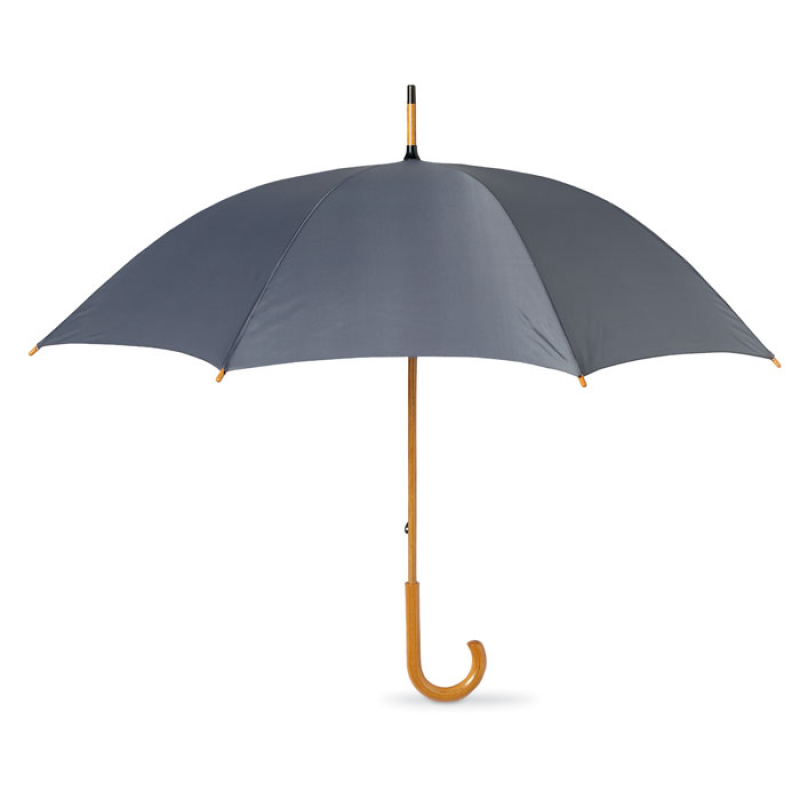 23 inch manual open umbrella in 190T polyester with wooden shaft, tips and top. Black plating metal ribs. Curved wooden handle. Wood in natural finish. Manual closure.