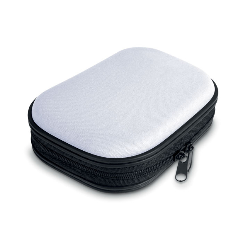 First aid kit in EVA material. Includes 1 pair of scissors, 3 pad bandages, 1 triangular bandage, 1 roll of cotton, 2 cleaning tissues, 5 adhesive bandages, 1 roll of tape and 6 cotton buds.