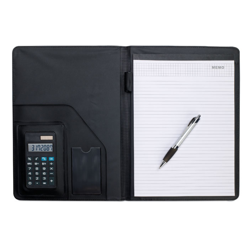 Imitation leather A4 portfolio with solar powered calculator, blue ink ball pen and 20 page lined notepad.