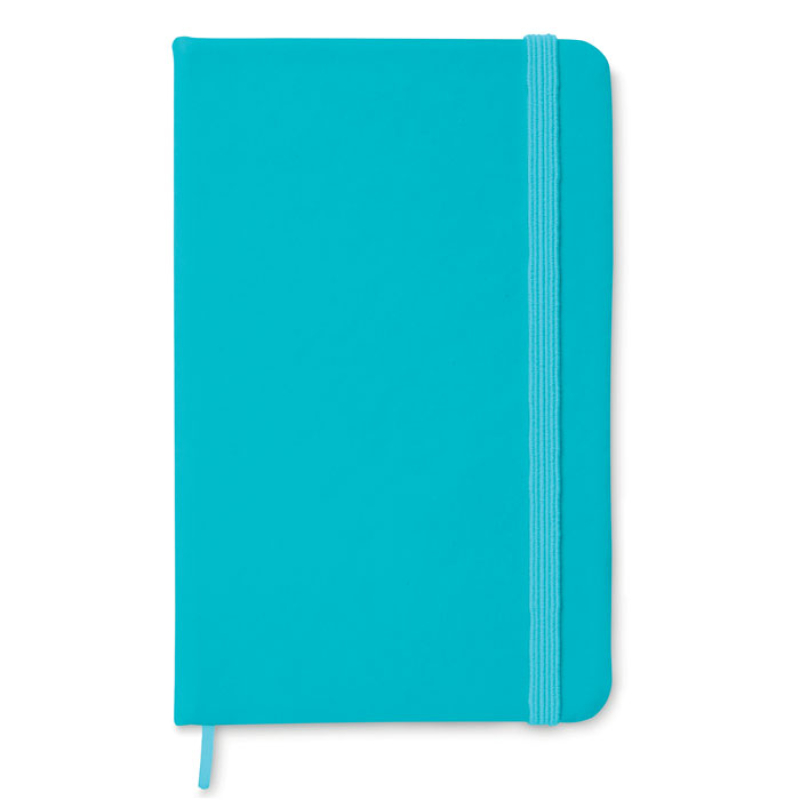 A6 notebook with soft PU cover and 96 lined pages closed with an elastic band.