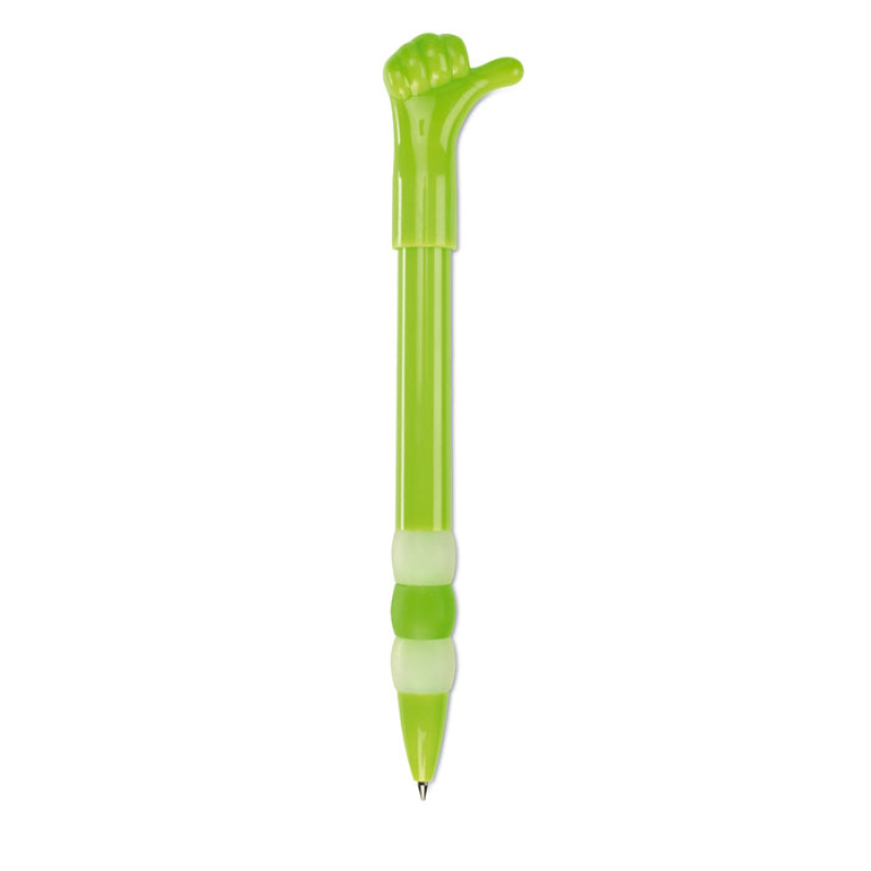 Thumbs up for this plastic ball pen, featuring a hand shape push button. Blue ink.