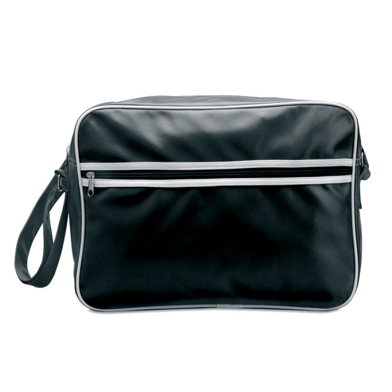 Document bag in matt finish PVC with white trimming and piping. Front pocket closed by horizontal zipper. Adjustable shoulder strap.