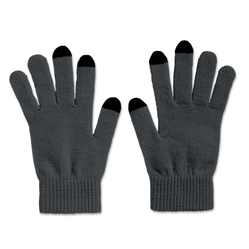 Tactile gloves for smartphone in acrylic. The 3 tactile extremities of the fingers are composed of 0.5% in stainless steel fibre, 89.5% in acrylic, 10% in spandex.