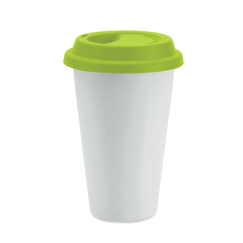 Double wall ceramic travel tumbler with silicone lid. Cup capacity: 275 ml. Ideal for hot beverages. Not suitable for microwave use. Pad printing is not dishwasher safe. Ceramic transfer is dishwasher safe.