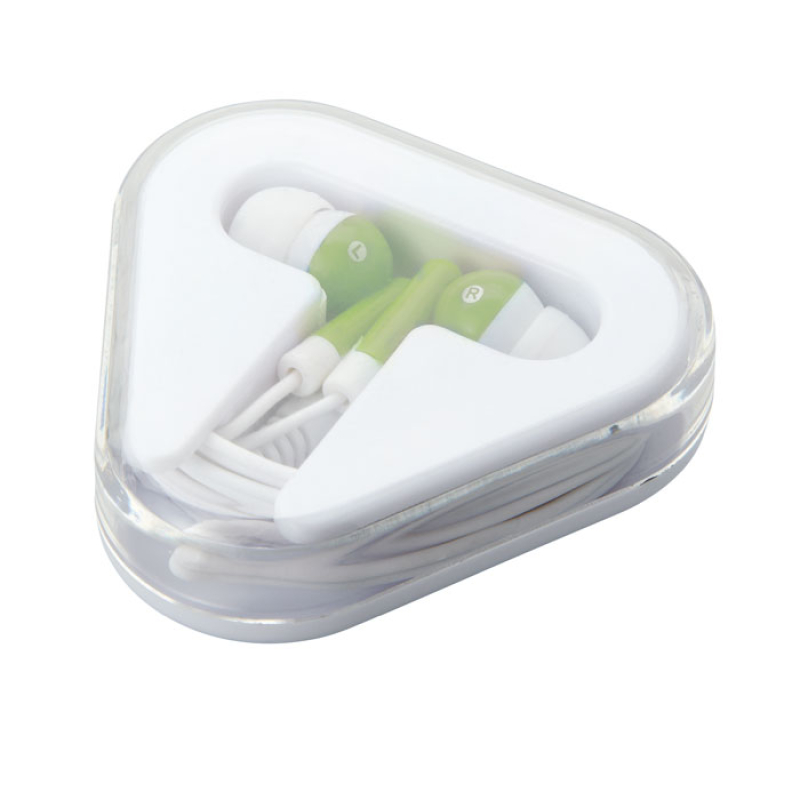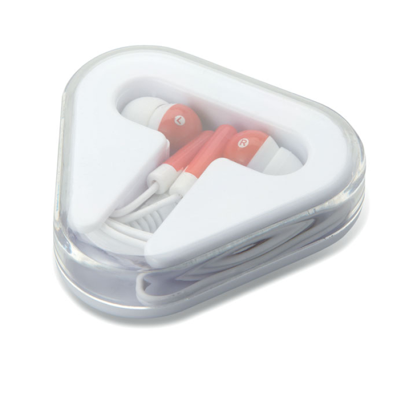 Earphones in PVC housed in a triangular PS case. Cable length 120 cm.