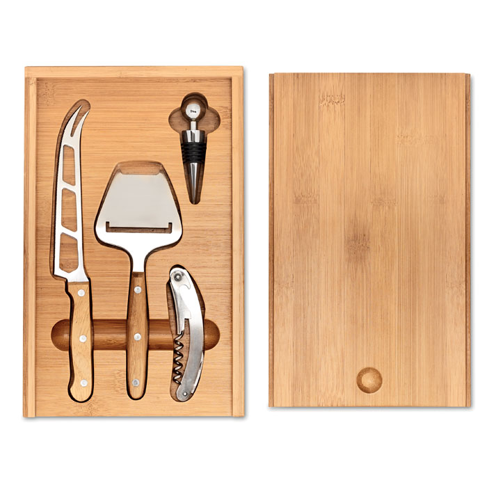 Bamboo cheese and wine set. Includes a stainless steel-knife, cheese peeler, bottle opener and wine stopper. Presented in bamboo box.