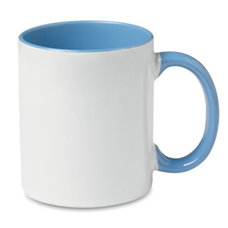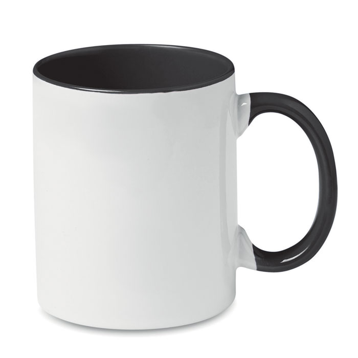 Ceramic mug of 300 ml capacity with special coating for sublimation with coloured handle and inside. Individual packing in white carton box. Pad printing is not dishwasher safe. Ceramic transfer is dishwasher safe.
