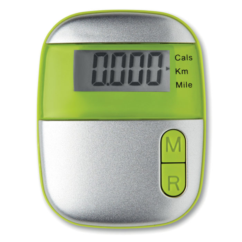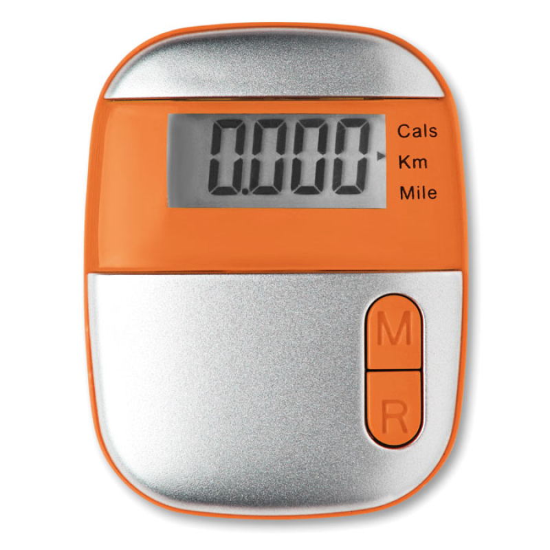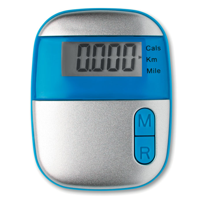 Pedometer with clip in ABS casing. With step, distance (miles and kilometres) and calorie counter, 1 cell battery included.