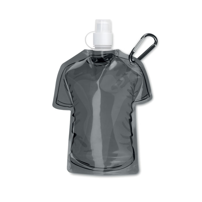 Foldable water bottle in T-shirt shape with carabiner. Capacity 480 ml.